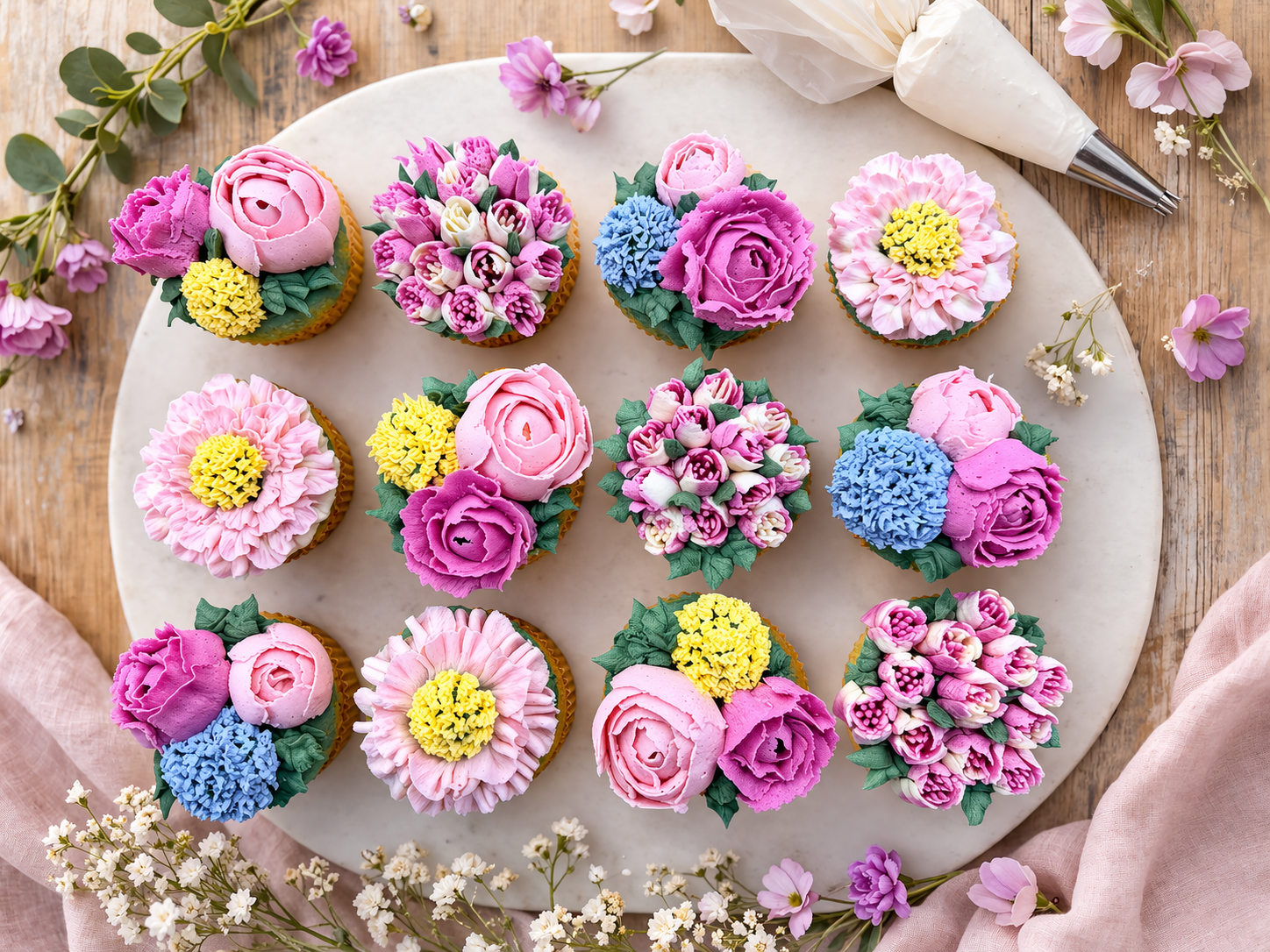 You'll go home with a dozen beautifully decorated cupcakes featuring a variety of floral styles and color combinations—perfect for gifting, celebrations, or simply showing off your new skills.